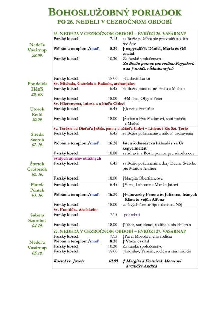 Bohoslužobný Poriadok po 25. Nedeli v celoročnom období