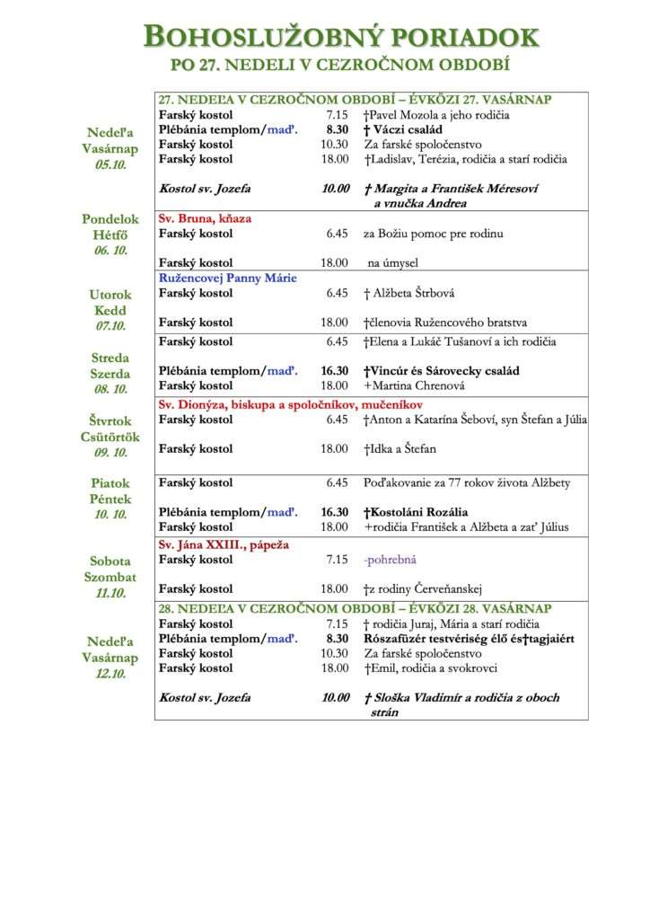 Bohoslužobný Poriadok po 26. Nedeli v celoročnom období
