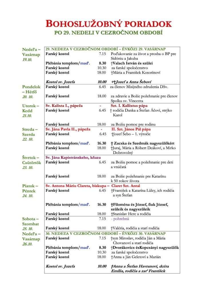 Bohoslužobný Poriadok po 28. Nedeli v celoročnom období