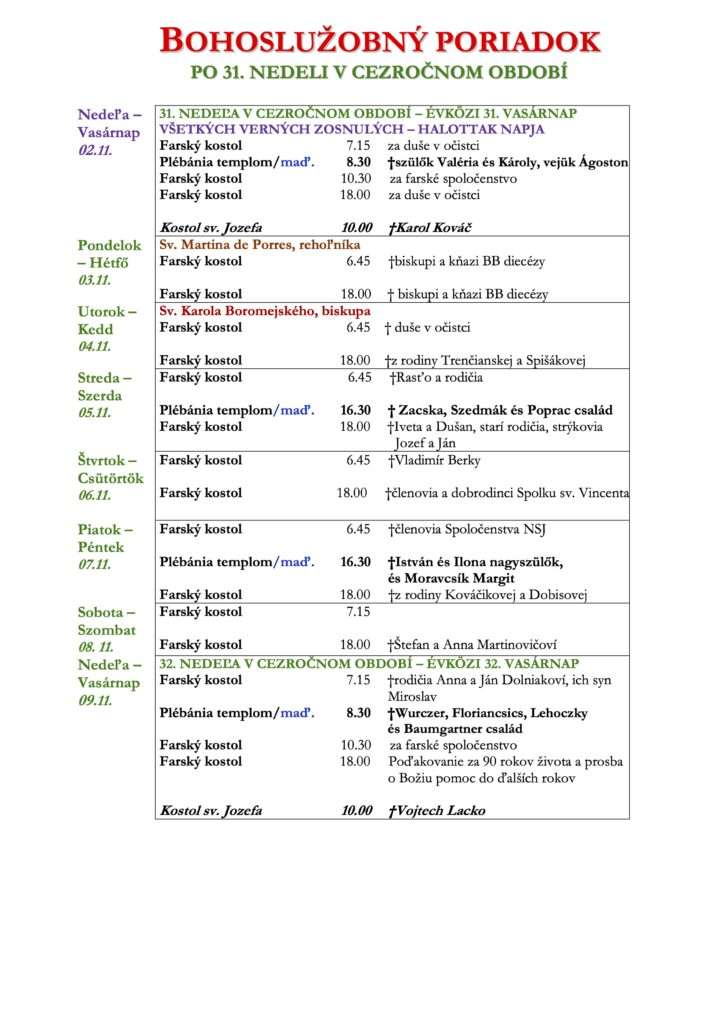 Bohoslužobný Poriadok po 30. Nedeli v celoročnom období