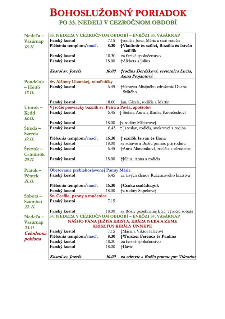 Bohoslužobný Poriadok po 32. Nedeli v celoročnom období
